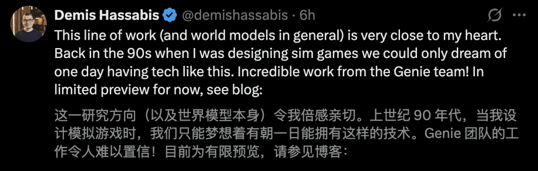 Hassabis同样感慨道,上世纪90年代,当自己设计模拟游戏时,曾梦想有一天实现这一技术。如今,愿望终于达成。