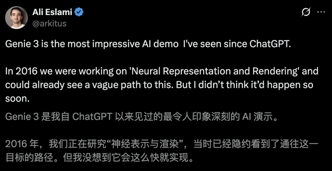 谷歌DeepMind研究员Ali Eslami惊叹道,Genie 3绝对是自ChatGPT以来最令人印象深刻的演示。
