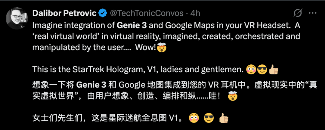 也有网友脑洞大开,表示既然都是谷歌一家的,Genie3+谷歌地图+VR=真实虚拟世界。