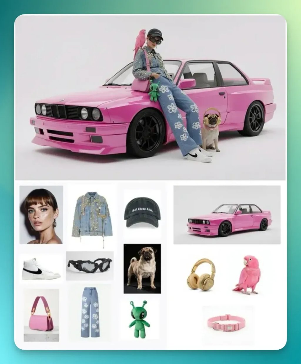 像是一个非常流行的案例:用 Nano Banana 模型,将 13 张输入图片,融合成一张完整、风格一致的图像: