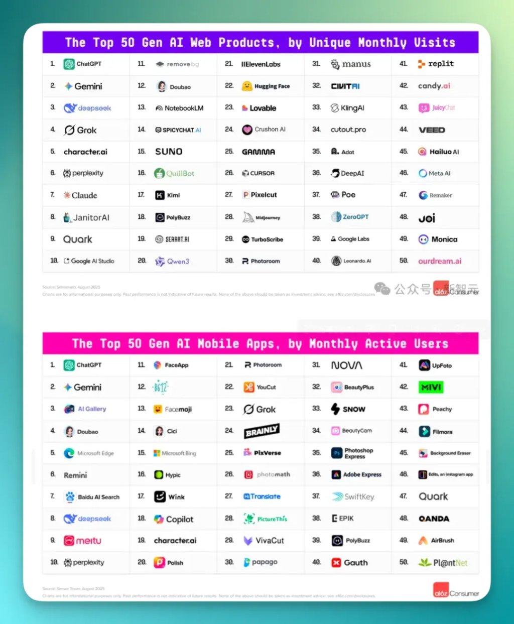 就在一周前,知名风投机构  a16z 出了一份最新报告,是关于百大生成式 AI 消费应用排行榜的。在这份榜单里,我们看到无论是在网页端还是移动端,Gemini 的用户活跃度均已升至第二,仅次于 ChatGPT: